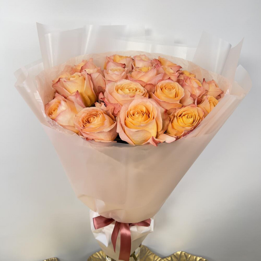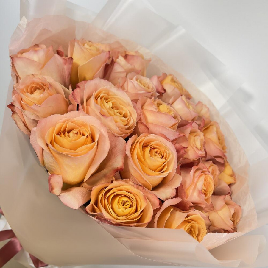 На фото букет из 23 коралловых роз. В составе: роза 23 шт, дизайнерская упаковка 1 шт, атласная лента 1 шт, . Все цветы свежие и ароматные, букет красиво оформлен и отлично подходит для подарка. Доступна доставка цветов или самовывоз.