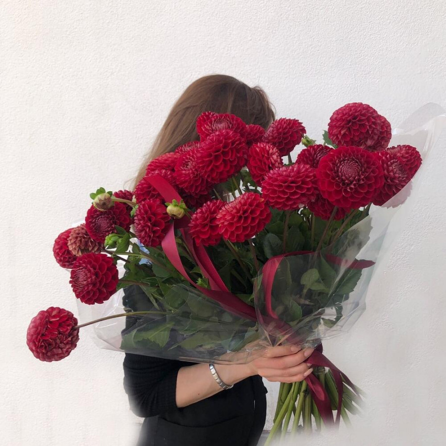 На фото букет из 29 красных георгин. В составе: георгина 29 шт, дизайнерская упаковка 2 шт, атласная лента 1 шт, . Все цветы свежие и ароматные, букет красиво оформлен и отлично подходит для подарка. Доступна доставка цветов или самовывоз.